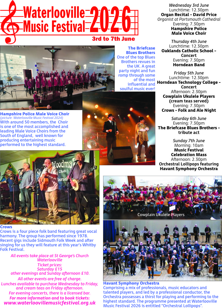 About St George’s Church | all about us & Contacts list | Notices and Facebook | Sunday Bulletin, PCC & ACPM ReportsRegisters, Baptisms, Weddings | Feedback, Donations | Mailing list | Church Hall Organisations| Waterlooville CinemaSt George’s News (latest & past magazines) | Advertisers | Waterlooville Music Festival 2026 | Safeguarding | Church Shop